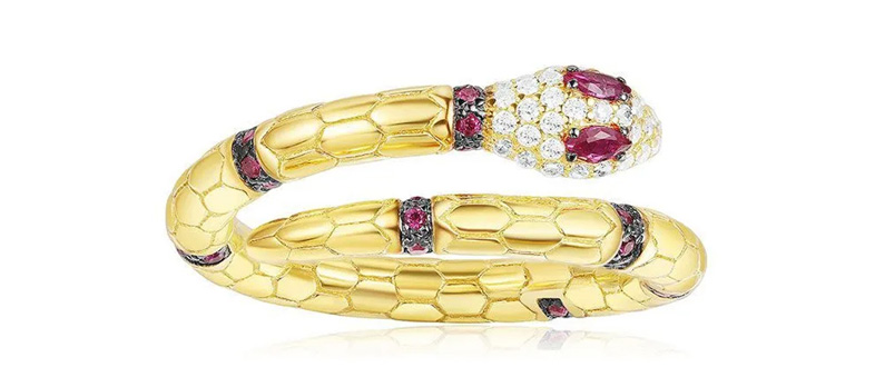 | 商品编码 | E660786 | 商品名称 | 蛇形开口戒指配以白色和勃艮第宝石-金黄色银 |