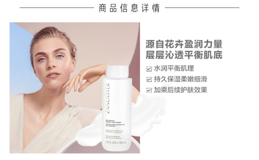 | 商品编码 | C054704 | 商品名称 | 兰嘉丝汀白水柔润爽肤水400ml 保湿补水 |