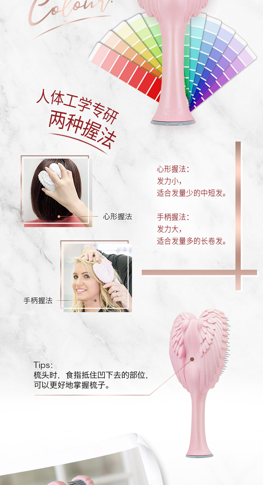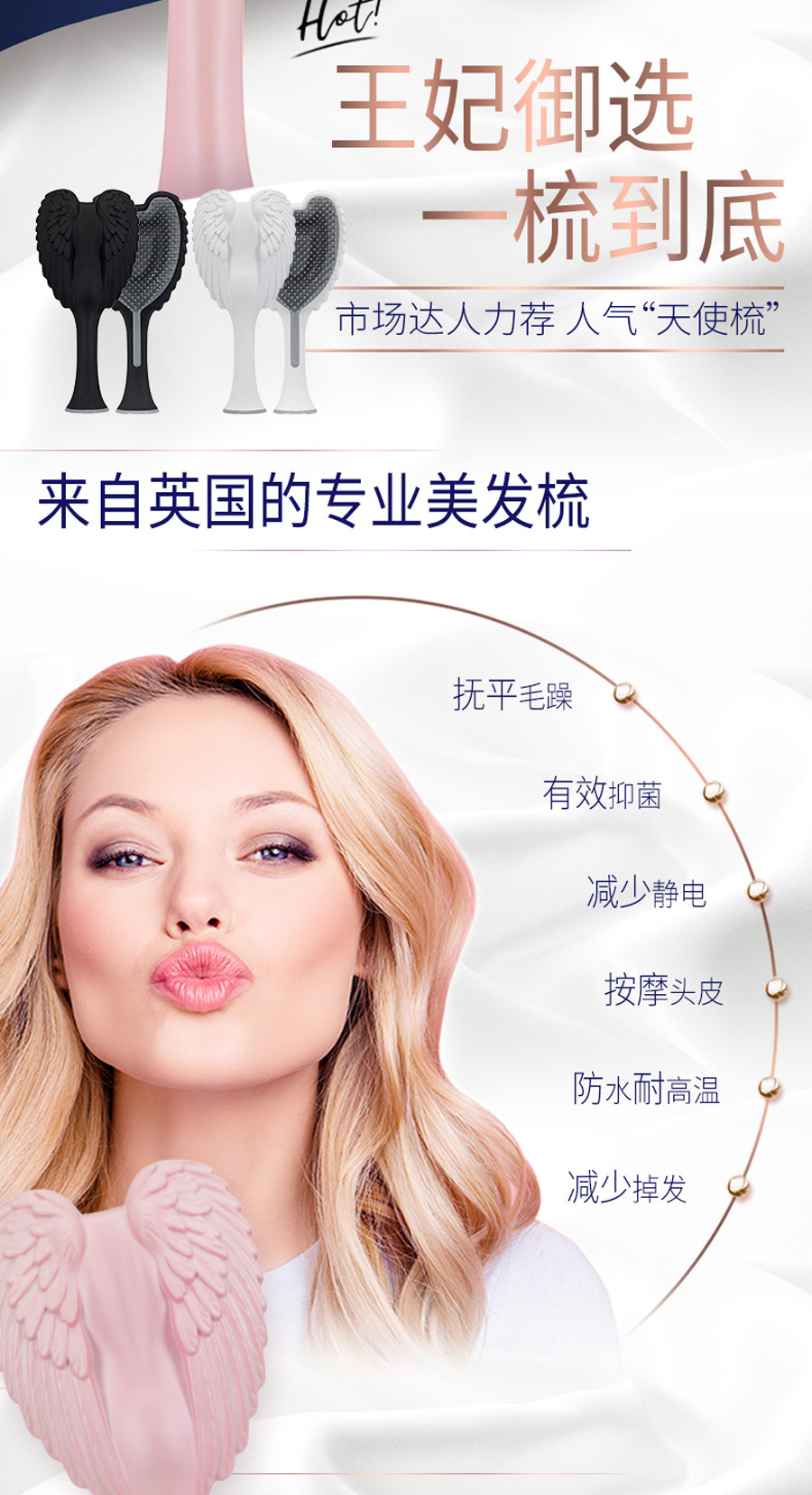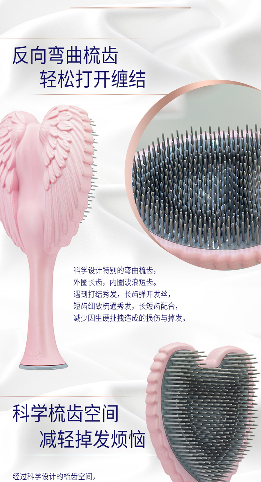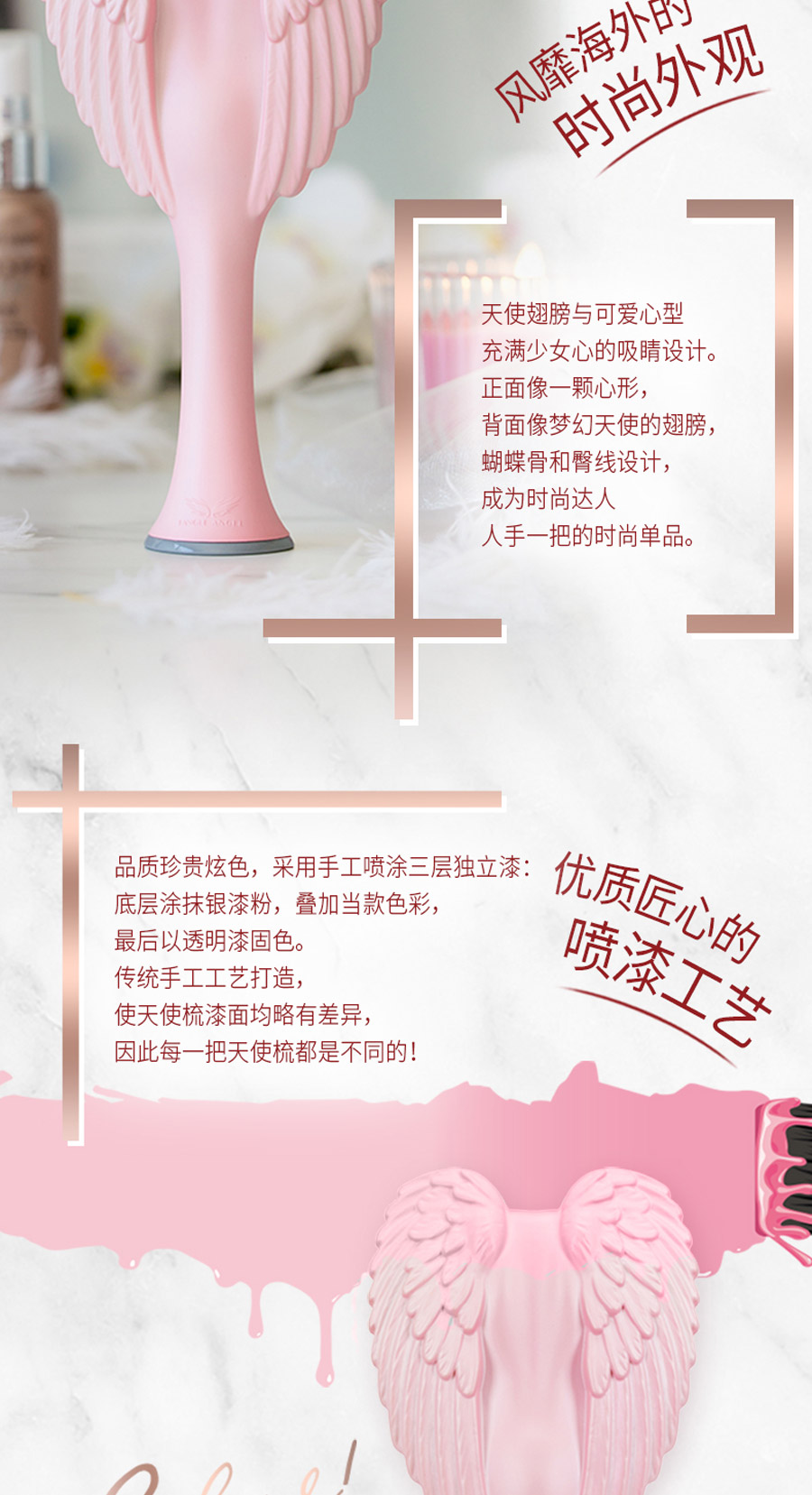 这是一款时尚和科技的完美融合,耐高温、柔软整齐、防静电的天使梳。