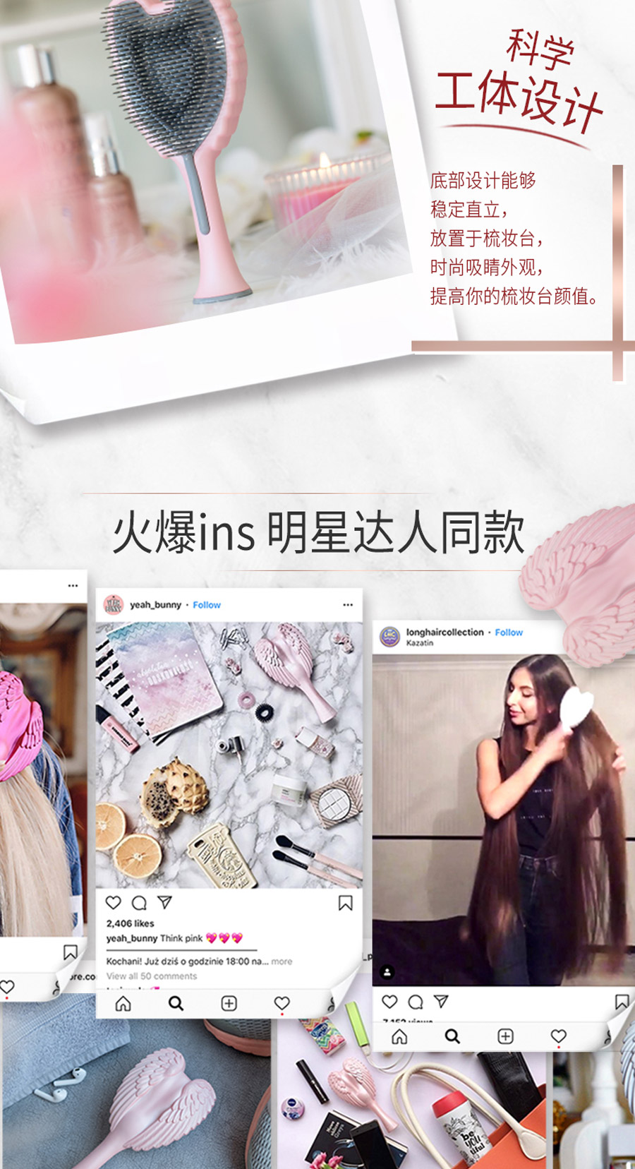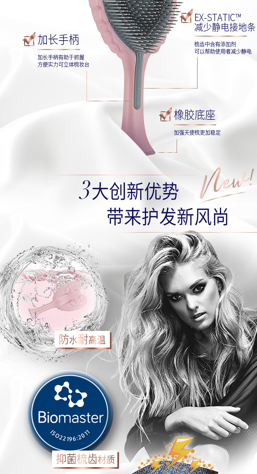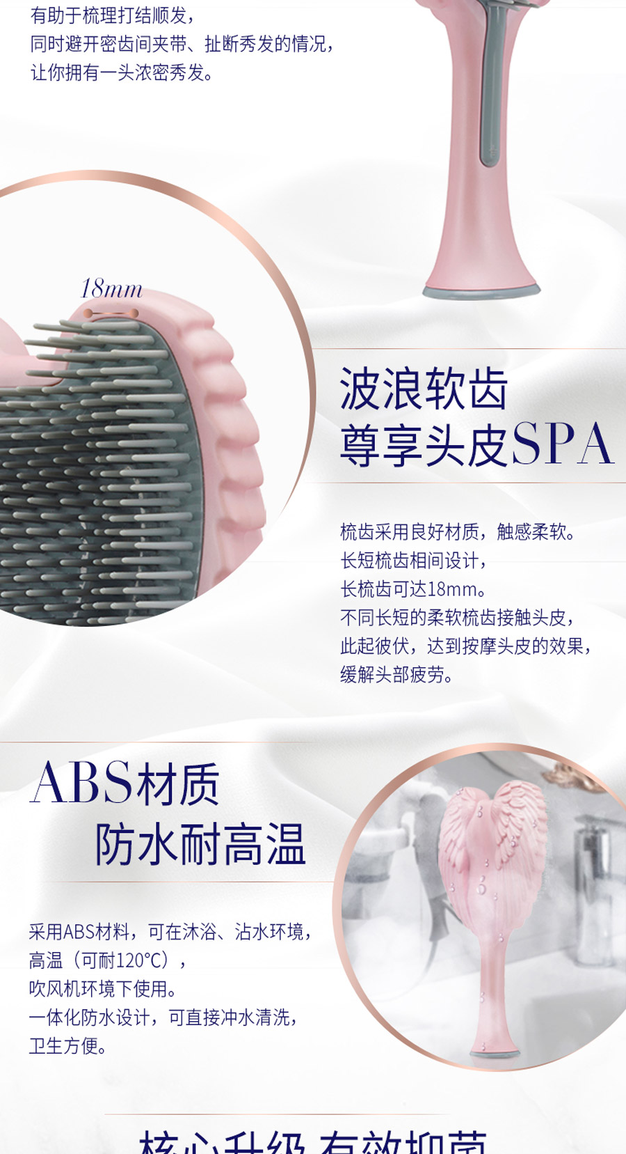 这是一款时尚和科技的完美融合,耐高温、柔软整齐、防静电的天使梳。