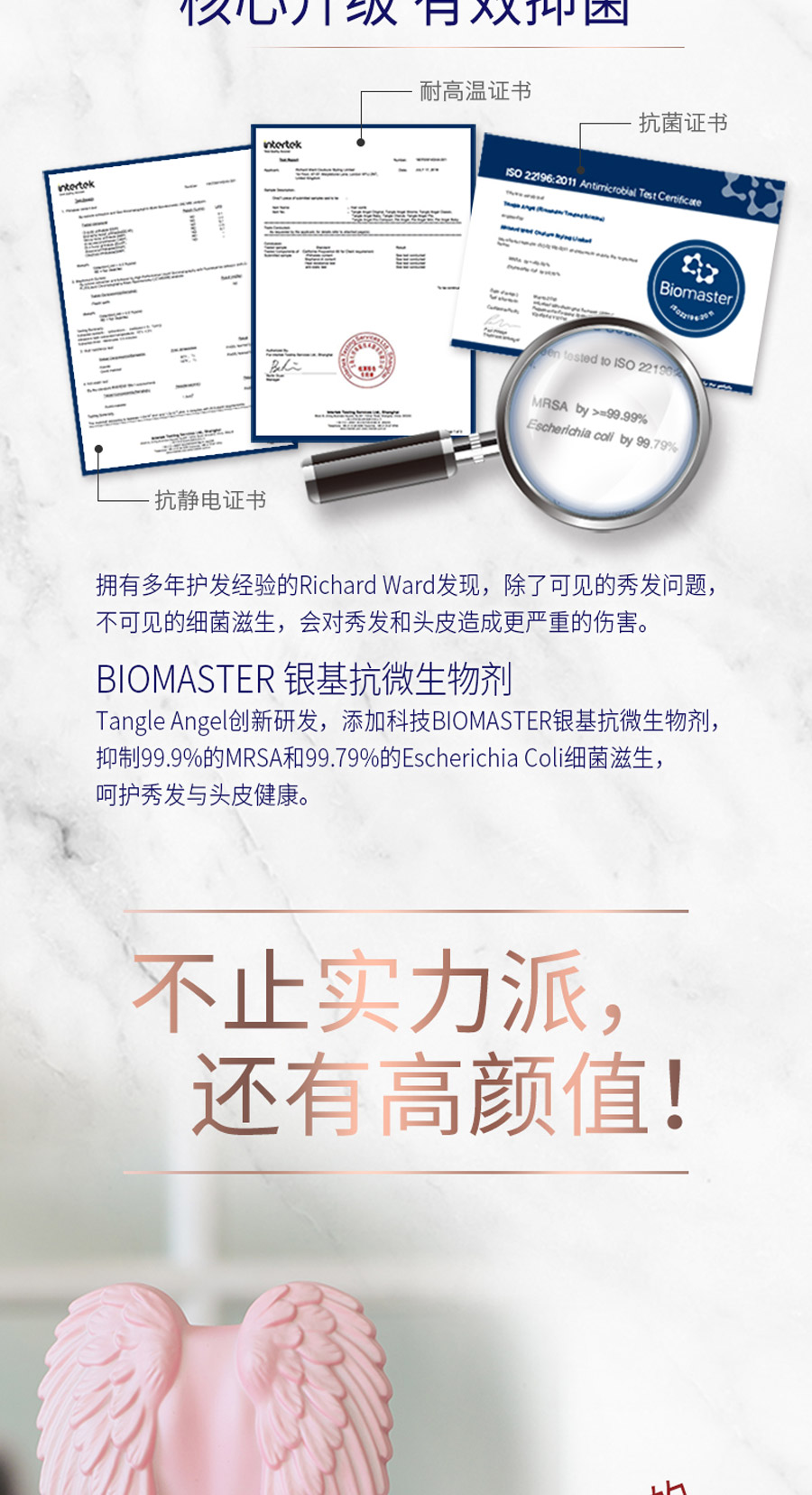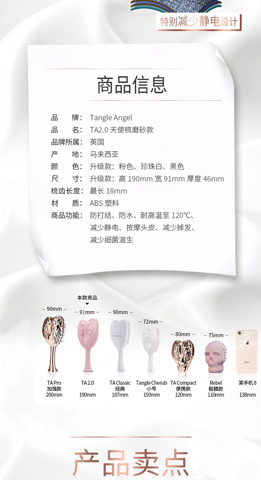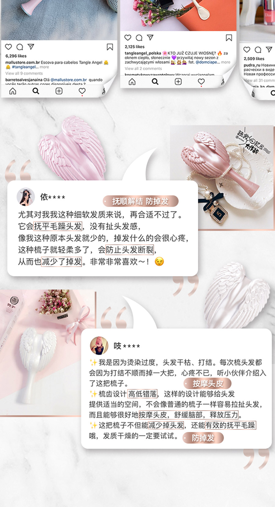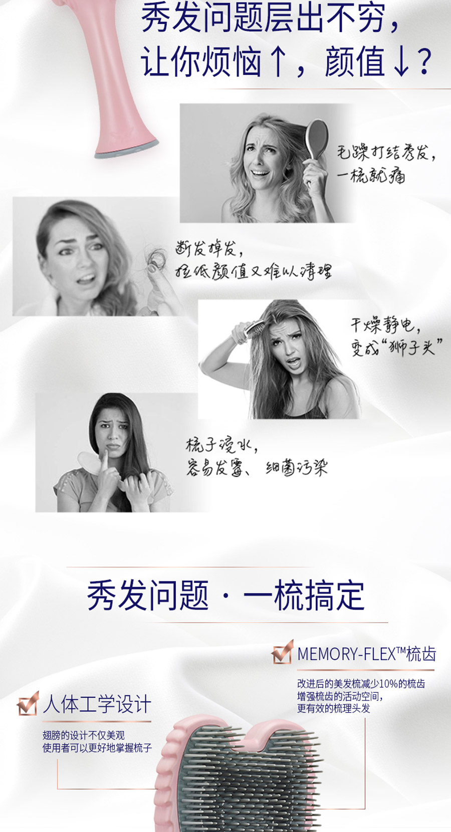 这是一款时尚和科技的完美融合,耐高温、柔软整齐、防静电的天使梳。