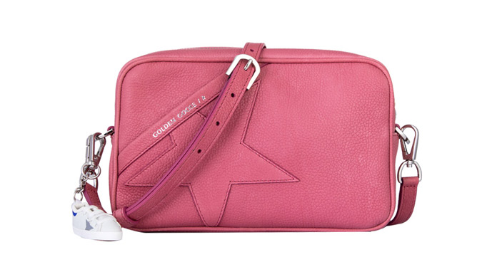 GOLDEN GOOSE创始人从老式相机包中汲取灵感,采用以天然小牛皮加工而成,特别柔软耐用,正面有星星和GOLDEN GOOSE的品牌LOGO,侧面还有一个经典运动鞋样式的钥匙链。Star Bag还可以搭配系列中任何一款大号手提袋。